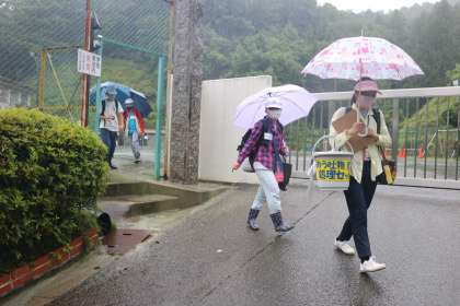 雨の状況が心配される中、5年生が6年生からの応援メッセージを受け取り、旭高原自然の家でのキャンプに出発しました。