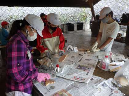 旭高原自然の家に到着後、集いの広場で初めの会を行いました。その後、学校ごとに創作活動『動物焼き杉(かべかけ)をつくろう!』を行いました。