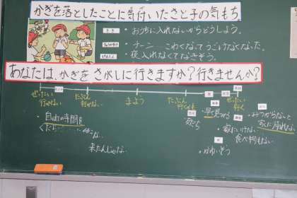 主発問での気持ちを、心情直線の5段階で示し、その理由を発表する場面で、「行かない」という意見と「行く」という意見に分かれました。「行かない」と考えた子は1名でした。実際、楽しみにしていたレクを後回しにしてまで、友だちの鍵探しをしてあげられるのか?「行く」と考えた子ども達に、心の揺さぶりをかけたかったところです。