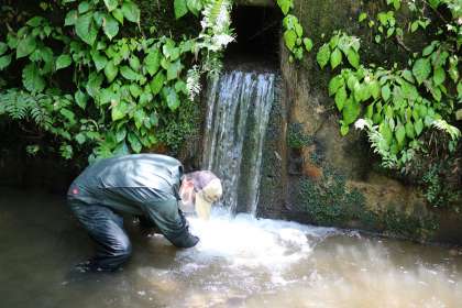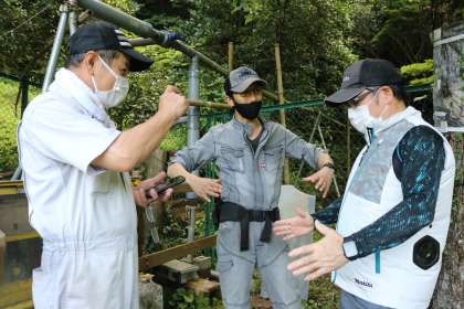 令和元年度、水車会に設置いただいた発電型水車の取水口を新設する活動も始動しました。大雨が降ると水車の水源である取水口部に大量の水と土砂が流れ込み、水車までの送水管がつまって、水車が回らなくなる状況をなくすために、水車のメインテナンス事業として取水口部を新設することになりました。