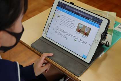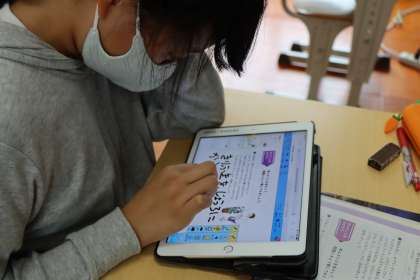 学校への登校を控える3名の子どもたちと一緒に、実験結果を振り返りながら、タブレットのワークシートにまとめていました。