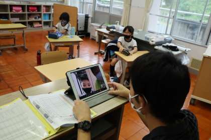 3・4年生も、登校を控える2名の児童とともに登校している7名と担任で、オンライン朝の会を行っていました。タブレットの角度調整をして、つながった2名に確認してから、司会者が前に立って、いつも通りの朝の会が行われていました。