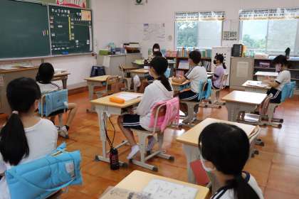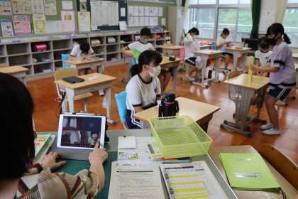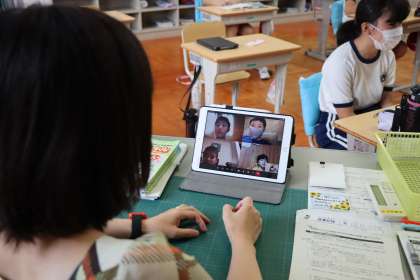 5・6年生も、登校を控える4名の児童とともに登校している9名と担任で、オンライン朝の会を行っていました。タブレットの角度調整をして、落ち着いた雰囲気の中で朝の会が行われていました。