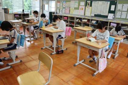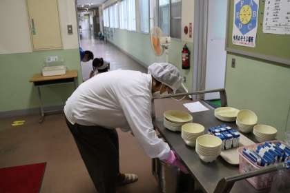 各自が食器を片付け、トレイに集まったものを代表が配膳室前まで運びます。食べ終わった子どもたちは、マスクを着用してタブレットを活用したり、読書やドリル学習をしたりして、落ち着いた態度で過ごしています。