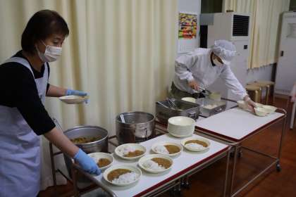 ランチルームで公務手さん2名と養護教諭で、トレイに給食を学年ごとに配膳します。