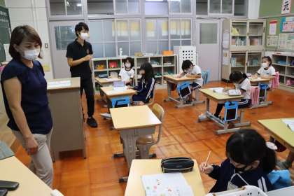 ワークシートに、相手の友達の予想を書き、質問して確かめていました。その学習後、映像を見て、登場人物の好きなものを確かめました。