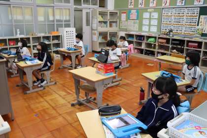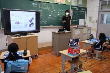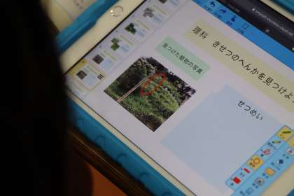7月〜8月、授業や自宅で見つけた植物や生き物の観察写真を取り上げ、夏の終わりの9月との違いについて、タブレットでまとめました。