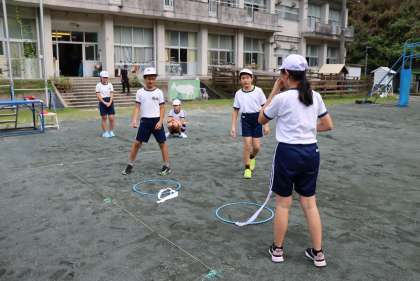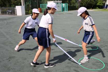 体育の授業も、コロナ感染防止のため、活動に制限があります。3人組ペアを作って、お互いの距離が取れるようにリングにひもをつないで、交互に跳躍する準備運動を行いました。