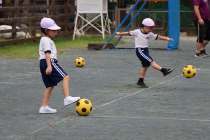 体全体を使って、踏み込んでボールをけることを体感するように練習しました。ボールを自分の前に置いて、インサイドキックとインステップキックでけっていました。タイミングよく体重がのって勢いよく遠くへ飛ばす子もいました。10月21日の講習がとても楽しみです。