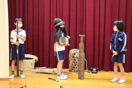 3・4年社会 「くらしを守る」 〜児童集会発表(郷土資料館で学んだこと)練習3火事の時に使う道具〜 9月10日(金) 公開日 2021/09/10 更新日 2021/09/10 校長室から 火事が起きた時に使う昔の道具が、いっぱいでてきます。消防車は来ません。地域にくらす人々は、どのように火災を食い止めたのでしょうか。