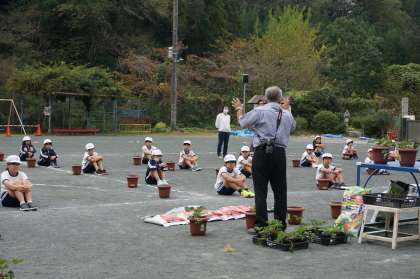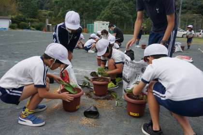 その苗ポットを一人一人が栽培・収穫できるように大きめの鉢に植え替える作業を行いました。校長先生から、植え替え時のポイントや栽培していくうえで大切なこと、収穫の時期は4月末〜5月であることを教えていただきました。