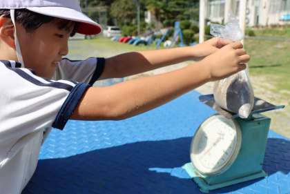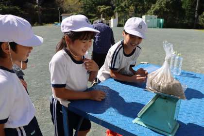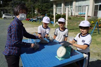 3年生が、1kg(1000g)の重さになるようにビニル袋に砂と水を入れていました。算数の「重さ」の学習で、1kgの重さを体感する目的の授業が行われていました。