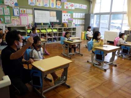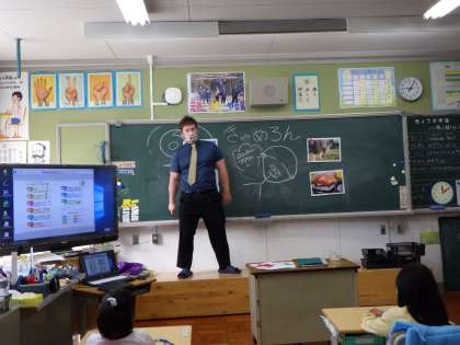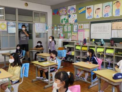 従来の女性のALTの先生がお休みのため、ピンチヒッターでC先生がお見えになりました。1・2年生は、体格のよい男性の先生に、おっかなびっくりでしたが、英語や身振り手振りを使って、おもしろい自己紹介を聞くことで、笑い声が聞こえてきました。