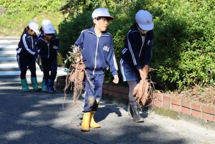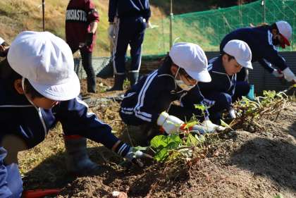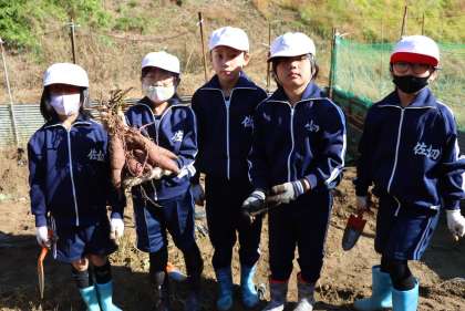 全校でサツマイモ掘りを行いました!(3中学年編) 〜11月6日学芸会後のPTA親子活動焼いも会用のサツマイモ〜 10月28日(木) 公開日 2021/11/23 更新日 2021/11/23 校長室から 中学年は、1つの苗にたくさんのサツマイモができていて、掘るのに最後まで苦労しましたが、収穫量は一番であったと思います。 何人かで協力して、掘り上げていました。収穫したサツマイモを畑から運ぶのも全員で分担して運んでいました。