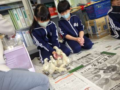 最初は、一か所にかたまっていたヒナたちですが、周りの様子を観察しながら少しずつ子どもたちの方へ近寄ってきました。