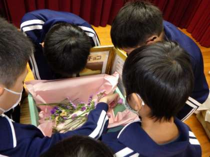最初に、4年生が「チョコは足が速かったです」「ミミズが大好きでした」など、チョコの特徴やよい所など思い出を紹介しました。