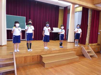 2年生の音楽では、「はしの上で」の歌に合わせて、リズム打ちの学習を行いました。歌詞を3文字の野菜や果物の名前に変えて、替え歌でもリズム打ちに挑戦しました。子ども達が考えた替え歌は、とても楽しい歌になりました。