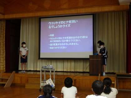 表彰の後は3.4年生の発表です。「ウコッケイクイズ」を出してくれました。タブレットを使い、グループごとに出題をしました。