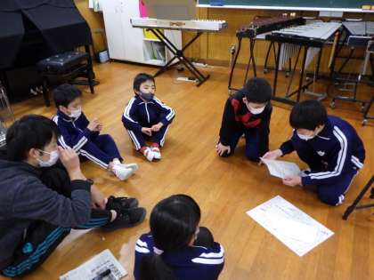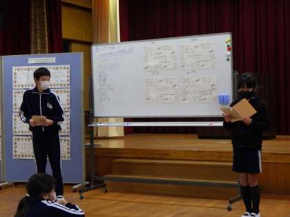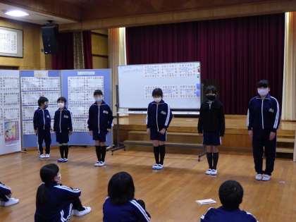その後、縦割り班に分かれ、班で話し合って標語を一つ作り、紹介し合いました。