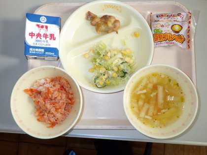 メニューは、ケチャップライス、グリルチキン、コーンサラダ、野菜たっぷりスープでした。