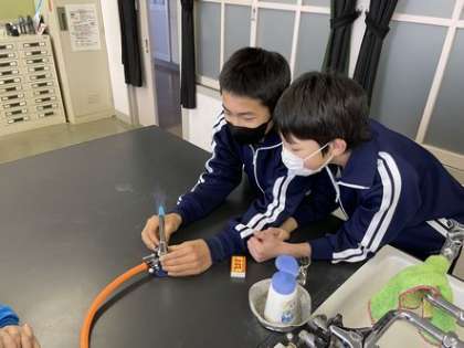マッチを擦ったり、バーナーのねじを回して空気やガスの量を調節したりして、一人ずつガスバーナーの操作を行いました。