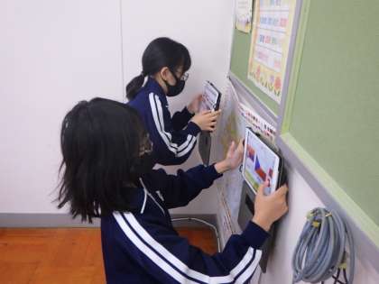 6年生の算数「線対象」の学習では、線対象の図形を身の回りから探し出して、学習用タブレットに撮影し、クラスで見つけた線対象の図形を共有していました。
