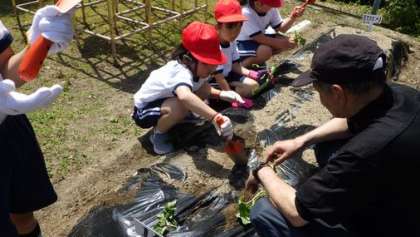 17日には、1年生が公務主の池本さんに苗の植え方を教わりながら丁寧に植えていました。