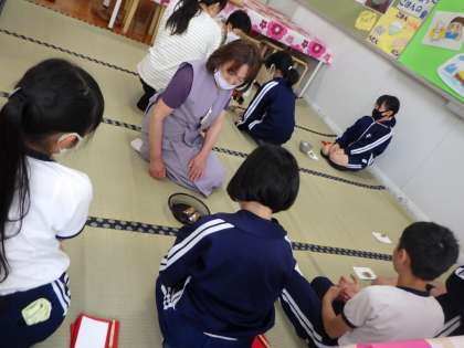 お茶クラブでは、お茶やお茶菓子をいただく時の作法について学びました。昨年のクラブ経験者が、新しく入ったメンバーに作法を教えている姿も見られました。