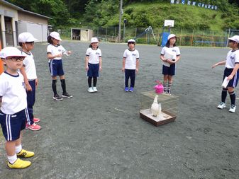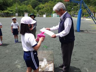 贈呈式では、子ども達がウコッケイの飼育について説明をした後、相談員の先生にウコッケイを預けました。