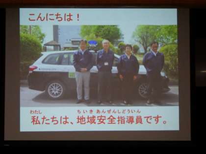 地域安全指導員のみなさんは、「子どもの連れ去り防止」のために、地域をパトロールしたり、防犯教室を開いて子どもたちに安全を呼びかけたりしている方々です。