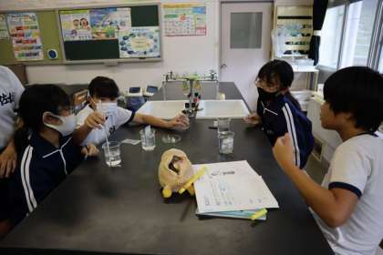 唾液を入れないものは青紫に染まり、唾液を入れたものは色の変化は見られませんでした。さてこの結果から、何がわかるか次回の授業で話し合います。