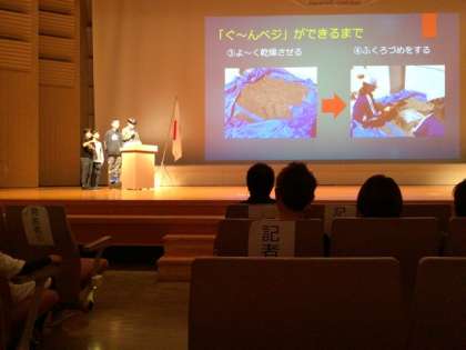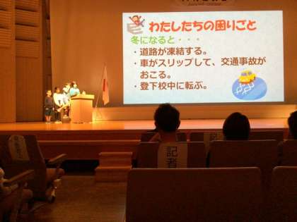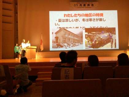 豊田青年会議所主催の「なやみごと こまりごと」募集に応募しました。40近くの応募から8組が選出され、34年の道路凍結への悩み事と56年の佐切堆肥「ぐ〜んベジ」を広めるための困り事が選ばれ、4日にカバハウスで発表しました。その結果、子どもたちが生み出した解決策に多くの賛同が得られ、ぐ〜んベジの商品化および凍結道路の安全性を上げるためのキャンペーン横断幕の作成や融雪剤入れの提供をパネラーの方が約束をしてくださいました。子どもたちの取組や頑張りが認められ、嬉しそうな子どもたちの表情が印象的でした。