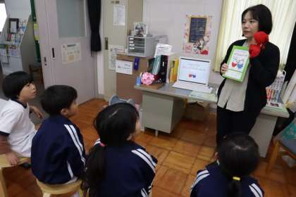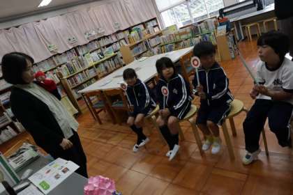 「本はどのように扱えばいいか」「本を持って帰るときの方法」など、〇×のプレートを挙げて、楽しくクイズに答えていました。