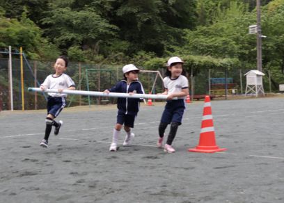 赤白に分かれ、3人組が棒を持って、コーンを回る競技です。