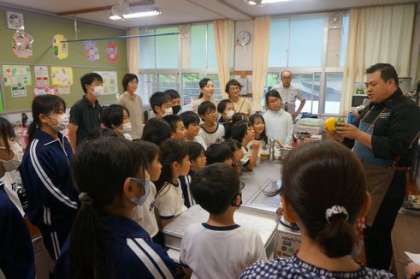7月1日(月)、フランス料理の近藤招宏シェフに来ていただき、自分たちで育てた野菜を使ったフランス料理の調理体験をしました。