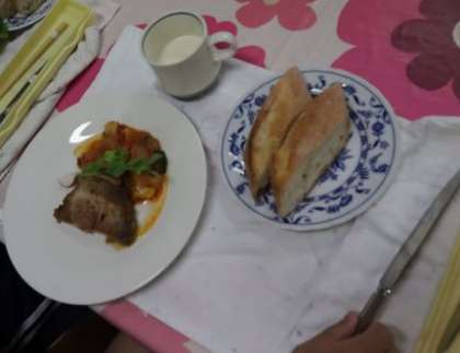 フランスパンと豚肉のコンフィを皿に盛り付けて完成です。フォークとナイフでいただきました。