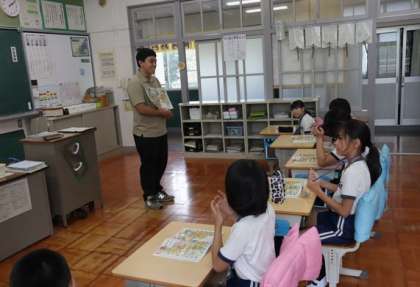 3・4年生では「アルファベット」の読み方を学んだ後、イラストの中に書かれているアルファベットを見て、先生の言うアルファベットはどこにあるか探す活動でアルファベットに親しんでいました。