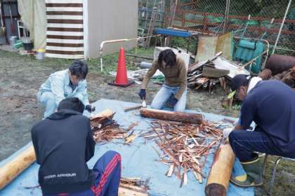 見晴台の整備、散策路の柵設置、丸太の皮剥ぎ、水車塗装などを行いました。