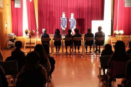 「運営・司会・寸劇」スタッフは、はじめの言葉で会場の雰囲気を盛り上げ、その後、6年生の日常をコミカルに寸劇で紹介しました。