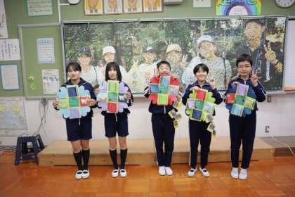 「会場装飾・招待状・プレゼント」スタッフは、6年間の思い出の写真を集め、楽しい仕掛けのあるプレゼントや招待状を作りました。また、会が終わると教室に黒板一面のモザイクアートを貼り、6年生にサプライズをしていました。