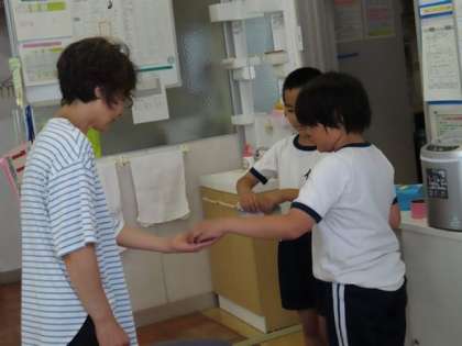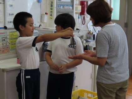 10日、職員室に来て「僕たちが育てたジャガイモ、買ってください」と看板を見せながら、大きな声で呼びかけをしていました。