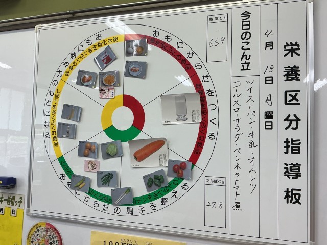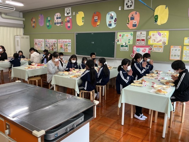 給食主任から、配膳の仕方やすこやか委員の活動について話がありました。全校児童がランチルームで楽しく会食をしています。