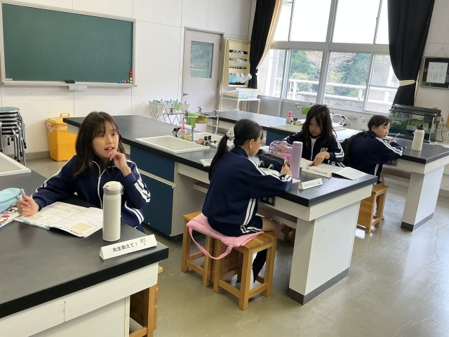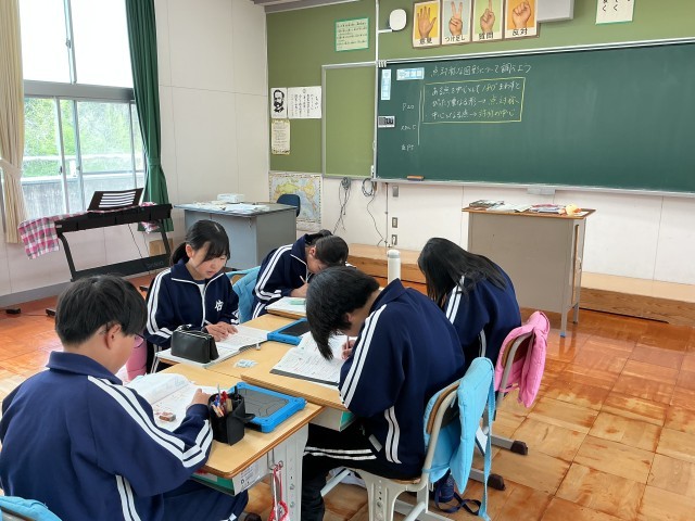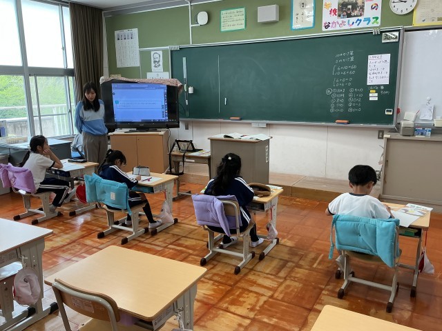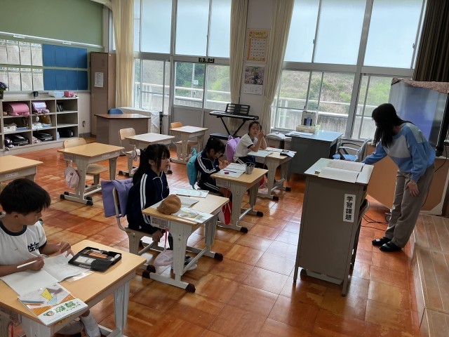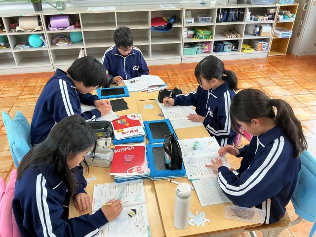 3・4年生の算数の授業では、学年ごとに分かれて学習をしています。3年生は九九の復習問題、4年生は「一億をこえる数」を学んでいました。また、6年生はアルファベットの形に切り出した図形を手に取り、点対称について理解を深めていました。常に班隊型にして学習をすることで、進んで聞きあう姿が見られました。