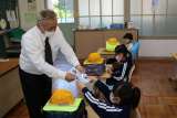 給食センターから調理された給食が学校に届くまでを学習してから、1年生教室で栄養...