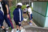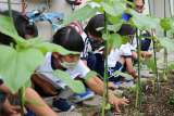 朝の飼育活動後に、子ども達は自分の育てているひまわりの苗を観察に来て、水やりを...