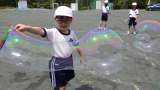割れずに風に流される、丈夫で変わった形の大きなシャボン玉に感動して、3〜6年生...