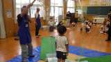 運動場でシャボン玉遊びをした後に、ジャンボシャボン玉体験を集会室でしました。子...