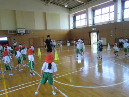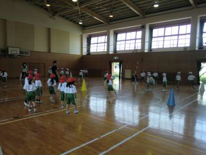 体育館で1年生が、3コートに分かれて、ドッヂボールをしました。