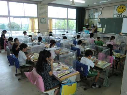 (感染症対策として、授業や給食中には机にディスクシールドをつけています。)