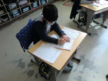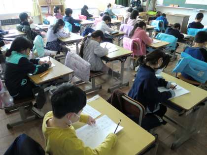 1,2年生は硬筆(鉛筆)、3〜6年生は毛筆で行いました。
